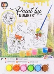 Spaßiges Malen nach Zahlen. Die Packung enthält 2 Bilder, ein Set mit 6 Farben und einen Pinsel. Verpackungsmaße ca. 22,5 × 31 × 2 cm. Alter 5+