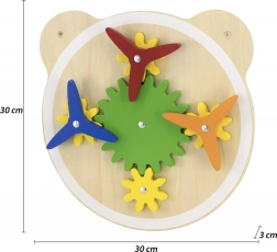 Die Holztafel in Form eines Bärenkopfes kombiniert fünf verbundene Zahnräder und drei Windrädchen. Kinder erlernen spielerisch das Prinzip von Ursache und Wirkung: Nach dem Drehen eines Rades setzen sich alle in Bewegung. So trainieren sie ganz natürlich Feinmotorik, visuelle Wahrnehmung und Teamarbeit, wenn sie sich an einem Panel abwechseln.
