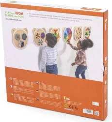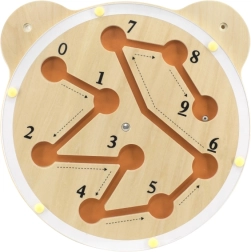 Diese wandmontierte Lern-Tafel von Viga in Form eines niedlichen Bärenkopfs verbindet Spiel und Lernen. Mit der drehbaren Platte wird die Stahlkugel durch die Rillen geführt, sodass sie nacheinander jede Ziffer von 0 bis 9 erreicht. Kinder trainieren spielerisch Zählen, Geduld und Problemlösung.