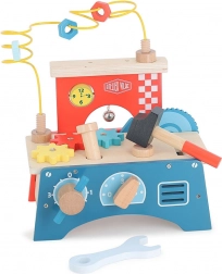 Spezielle Elemente wie ein Hämmerchen und ein Kugellabyrinth fördern die Koordination und Geschicklichkeit der Feinmotorik.