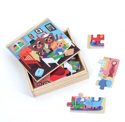 Vier einzelne Puzzles mit je 9 Teilen erzählen Schritt für Schritt das Märchen von Goldlöckchen und fördern Fantasie und Erzählfreude der Kinder.