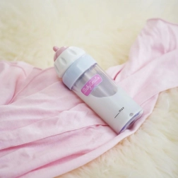 Das rosa-weiße Design zusammen mit der praktischen Skala macht die Flasche zu einem authentischen Zubehör für das Spielen.