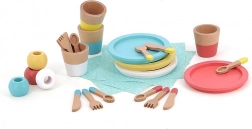 In der Packung finden Sie alles für kleine Esser: 4 Teller, 4 Becher, 4 Gabeln, 4 Messer, 4 Löffel und 4 Servietten mit Ringen. Pastellfarben verschönern jede Kindermahlzeit.