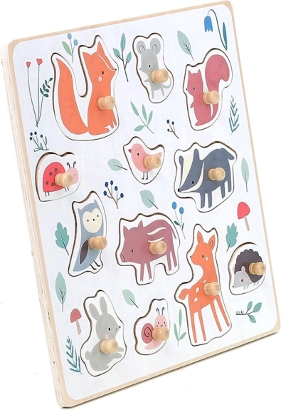 Dieses hochwertige Holzpuzzle mit Waldmotiven wurde in Zusammenarbeit mit der Illustratorin Sarah Betz entwickelt und bringt Kindern Freude am Entdecken. Farbige Punkte auf der Grundplatte geben sanfte Hinweise, wo welches Teil hingehört, und fördern so Konzentration und logisches Denken. Dank der stabilen Holzgriffe üben Kinder den richtigen Griff und entwickeln ihre Feinmotorik.