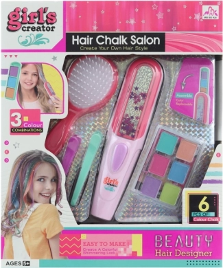 Set für kleine Friseurinnen. Die Packung enthält Haarkreiden, einen Applikator, eine Haarbürste und zwei Spangen. Verpackt in einer Schachtel. Verpackungsmaße ca. 26×31×6 cm. Alter 5+.