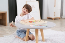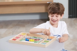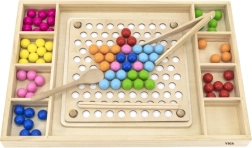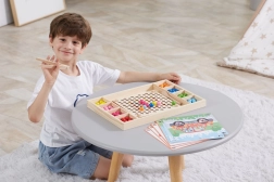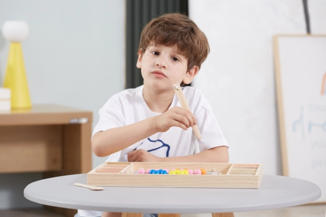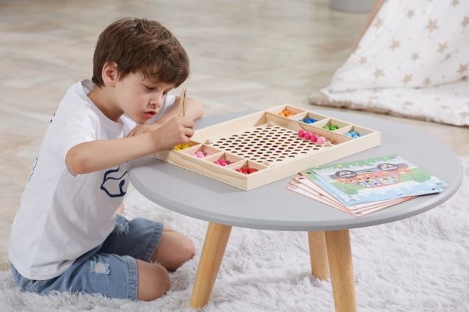 Das Holz-Bildungsspiel "Fang und Sortiere" ermöglicht es Kindern, verschiedene Muster und Farben entweder anhand von beigelegten Papierbögen oder ihrer eigenen Fantasie auszuprobieren. Mit diesem Spiel haben Kinder die Möglichkeit, Papier auf ein Holztablett zu befestigen und mit Hilfe von Stäbchen, einem Löffel oder einem Clip farbige Kugeln in die Löcher auf der Platte zu legen. Am Ende können Kinder schöne Bilder erstellen.