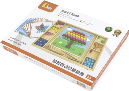 Holzspiel "Fang und Sortiere" von der Marke Viga für Kinder ab 3 Jahren, das nicht nur deren Fähigkeit zur Erkennung von Farben und Mustern fördert, sondern auch die Hand-Auge-Koordination und die Konzentration entwickelt.