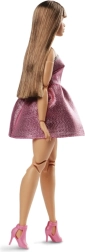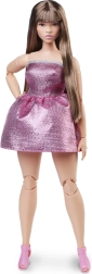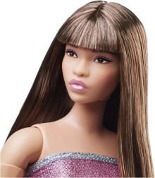 Die Barbie Puppe hat glatte braune Haare mit geradem Pony, markante Augenbrauen und glänzendes Make-up, das ihren Look vervollständigt.