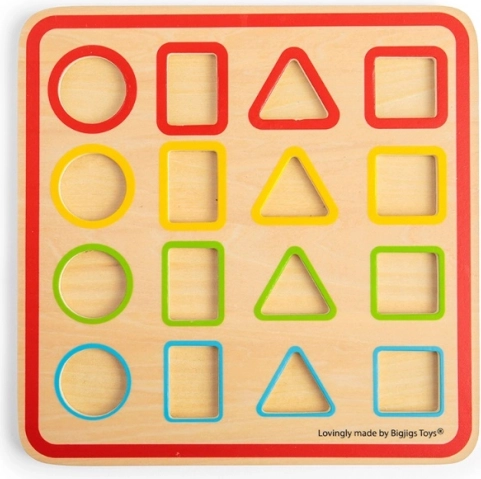Das Set enthält eine stabile Grundplatte und 16 Holzteile in verschiedenen Formen und Farben. Das kompakte Maß der Platte 25 × 25 × 0,9 cm passt auf den Kindertisch, ist ideal für unterwegs und lässt sich leicht verstauen.