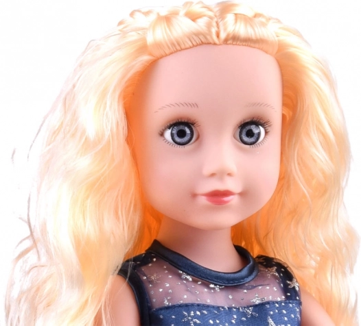 Elegante Puppe mit langen blonden Haaren in einem wunderschönen blauen Kleid mit Sternen, die stundenlangen kreativen Spielspaß bringt. Sie hat bewegliche Arme, Beine und einen beweglichen Kopf, besteht komplett aus robustem Kunststoff und inklusive sind ein Ständer und ein Kamm zum einfachen Kämmen und Ausstellen.