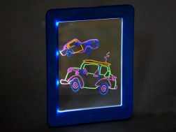 Das leuchtende Tablett ist ein großartiges Werkzeug zur Förderung von Fantasie, Kreativität und Feinmotorik. Kinder können eigene Motive zeichnen oder die Vorlagen der beiliegenden Kärtchen leicht nachzeichnen und anschließend in den Rahmen mit LED-Beleuchtung einsetzen. Mit aufgesetzter 3D-Brille erhalten ihre Werke einen räumlichen Effekt, der begeistert.