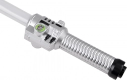 Der ergonomische silberne Griff mit Taste zur Aktivierung von Licht und Sound sorgt für sicheren Halt und intuitive Nutzung.