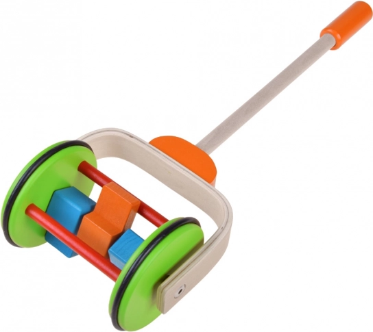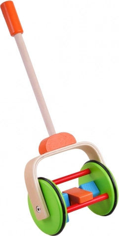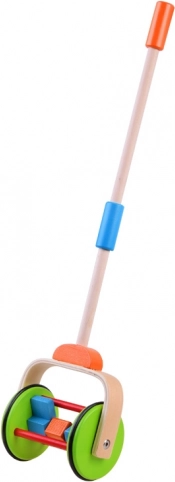 Das bunte Holzspielzeug zum Schieben ist so konzipiert, dass es Kinder bei ihren ersten Schritten unterstützt. Es hat einen an die Körpergröße des Kindes angepassten Griff mit Regulierungsmöglichkeit. Die Räder sind mit einem Gummiband versehen, um einen reibungslosen Betrieb und Schutz für den Fußboden zu gewährleisten.