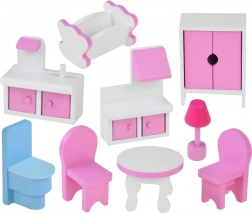 Enthalten ist eine vielfältige Möbelausstattung mit zu öffnenden Türen und Zubehör – von der Anrichte und dem Schrank bis hin zu Tisch, Stühlen und Wiege. Sofort spielbereit.