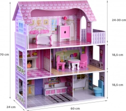Das Puppenhaus bietet eine durchdachte Aufteilung und reichlich Platz für Alltagsszenen. Die Maße 70 × 60 × 24 cm ermöglichen bequemes Spielen auch für mehrere Kinder.