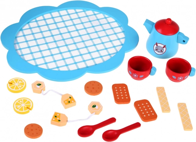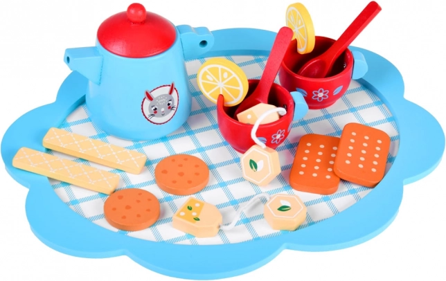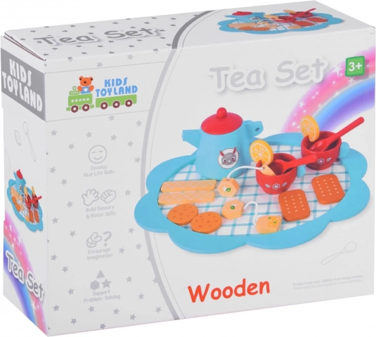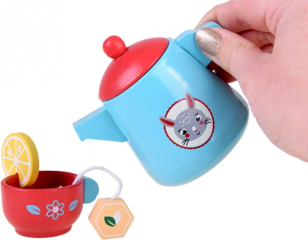 Dieses elegante Teeservice aus massivem Holz begeistert alle kleinen Gastgeberinnen und Gastgeber. Zarte Blau- und Rottöne, niedliche Motive und umfangreiches Zubehör fördern kreatives Spielen, soziale Kompetenzen und Sinneswahrnehmung. Kinder können Tee mit Zitrone servieren, Kekse anbieten und Tischmanieren üben.