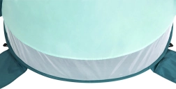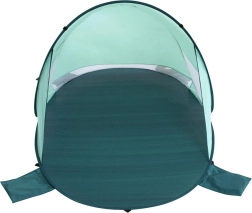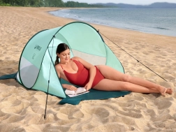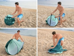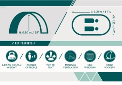 Das ausgeklügelte Belüftungssystem mit zwei Seitenfenstern und rückseitigem Mesh-Panel sorgt für ein angenehmes Klima im Inneren. 8 Heringe und 4 Sandtaschen erhöhen die Stabilität auch bei Wind, während die Glasfaser-Konstruktion leicht und flexibel ist. Das Zelt bietet bequem Platz für 2 Erwachsene und nimmt zusammengelegt in der mitgelieferten Tasche nur wenig Raum ein.