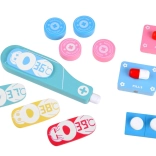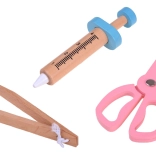 Spritze, Schere, Pinzette und Thermometer bestehen aus robustem Holz mit angenehmer Oberfläche. Sie fördern die Feinmotorik und sicheres Spielen.