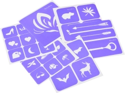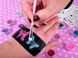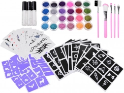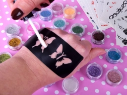 Einfache Schritt-für-Schritt-Anwendung: Schablone auswählen, auf die saubere Haut kleben, Motiv mit Kleber bestreichen, Schablone entfernen, kurz trocknen lassen und farbigen Glitzer aufstreuen. Überschuss abklopfen – fertig! Alles ist in einer praktischen, bunten Box für einfache Aufbewahrung verstaut.