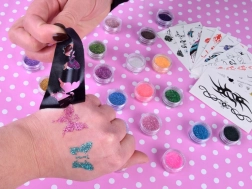 Das große Kreativset für Glitzer- und Wasserschiebebilder verwandelt jede Feier in ein Erlebnis. Mit der großen Auswahl an Schablonen und den farbenfrohen Glitzern gestalten Kinder individuelle, temporäre Tattoos, die mehrere Bäder überstehen und anschließend sanft verblassen.