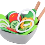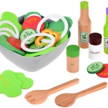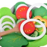 Kunststoffschüssel; 2 hölzerne Gewürzfläschchen; Salz- und Pfefferstreuer aus Holz; 2 hölzerne Salatlöffel; Filz-Salatblätter; Scheiben von Tomate, Gurke, Paprika und Zwiebelringe