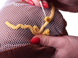 Dank der Netztasche und dem Haken ziehen Kinder das Garn sicher durch und gestalten die flauschige Oberfläche des Kissens ganz ohne Nähen.
