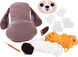 Kreatives Kissen in Hundeform für Kinder, die gerne ohne Nadel und Faden basteln. Ein weiches, flauschiges und sicheres Projekt: Mit dem beiliegenden Haken wird das Garn einfach durch die Netz-Tasche gezogen und so ein flauschiges Fell geschaffen. Das fertige Kissen wird zu einer schönen Deko und kuscheligen Spielzeug-Kissen fürs Kinderzimmer.