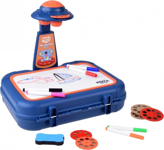 Koffer mit Zeichenfläche, Projektor-Lampe, verstellbarer Arm, 6 Bildschablonen, Schwamm zum Abwischen und 6 Marker.