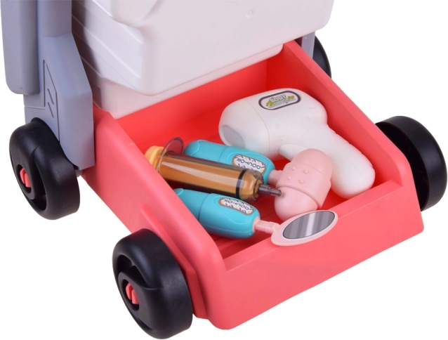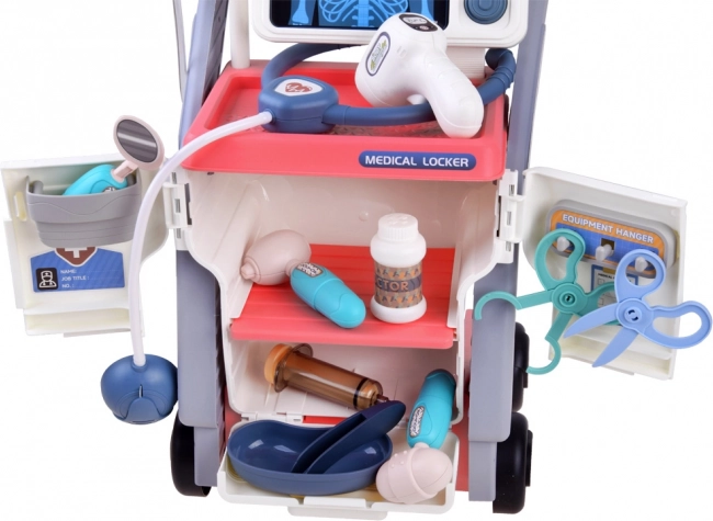 Das Set enthält einen Wagen mit Rädern, ein Stethoskop, eine Pipette, ein Thermometer, ein Otoskop, einen neurologischen Hammer, eine Spritze, einen Spiegel und mehr.