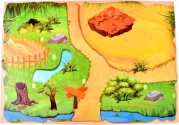 Die Spielmatte beinhaltet verschiedene Gelände wie Gras, Wege und einen Teich, welche die Spielerlebnisse der Kinder bereichern.