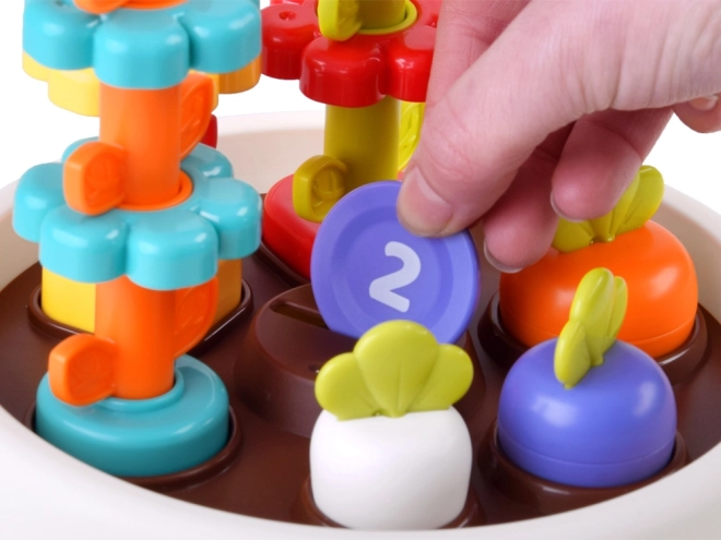 Das Spielzeug unterstützt die feinmotorischen Fähigkeiten des Kindes durch interaktive Elemente wie stapelbare Blumen und bunte Chips.