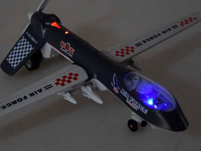 Durch Platzierung des Spielzeugs auf einer ebenen Fläche werden Sound- und Lichtfunktionen ausgelöst. Sie hören Start- und Motorgeräusche, Schüsse, Kampfgeräusche und das Cockpit sowie das Heck werden beleuchtet. Die Drohne ist ästhetisch mit Augenmerk auf Details gestaltet.