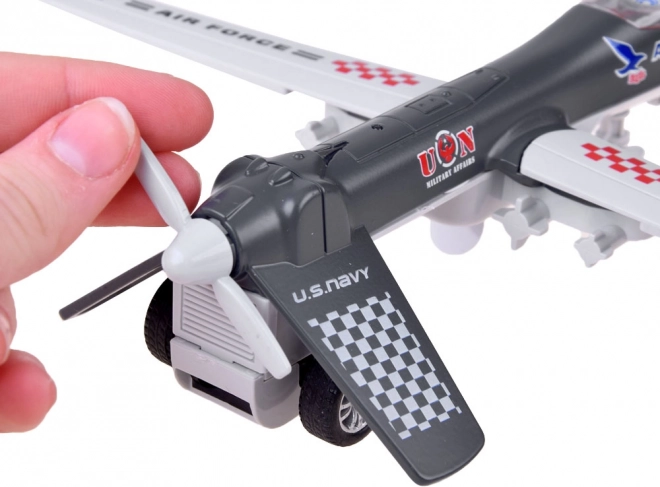Das Modell der Militärdrohne ist ein großartiges Spielzeug für alle, die sich für militärische Technik interessieren. Aus Metall und Kunststoff gefertigt, kommt diese Drohne in neutralen Tarnfarben und ist mit klappbaren Flügeln und einem beweglichen Rotor ausgestattet. Eine Schlüsselmerkmal ist der "Rückzieh-Antrieb" – ziehen Sie das Spielzeug einfach nach hinten und lassen Sie es los, um es vorwärts zu bewegen. Sobald die Drohne Geschwindigkeit aufgenommen hat, wird auch der Rotor aktiviert, der sich zu drehen beginnt.