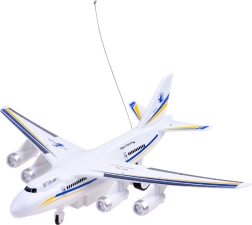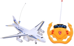 Unterhaltsames RC-Flugzeug für kleine Luftfahrtfans, gesteuert mit einem Controller in Lenkradform. Das Spielzeug bietet Lichteffekte (rot und blau) und fährt leicht über glatte, ebene Oberflächen. Es kann vorwärts und rückwärts fahren sowie nach rechts und links lenken. Robuste Ausführung aus Kunststoff in Weiß mit Details des Modells B718.