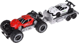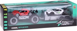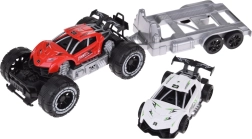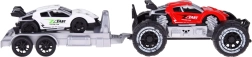 Geländewagen und Sportauto mit Anhänger bieten Spaß für jeden kleinen Motorsport-Fan. Die Autos sind aus Kunststoff gefertigt, und der Anhänger ist ideal für den Transport eines Sportwagens zu Rennen.