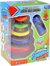 Dieses bunte, pyramidenförmige Kreisel-Set ist für Kinder verschiedener Altersgruppen konzipiert. Mit dem praktischen Griff (Launcher) lassen sich die Kreisel leicht in Rotation versetzen, was eine gleichmäßige und attraktive Bewegung auf Tisch oder Boden gewährleistet. Das Spielzeug fördert Hand-Auge-Koordination, Geduld und Konzentration.