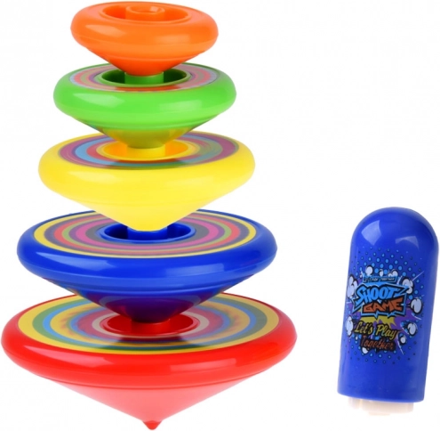 Fünf Kreisel in unterschiedlichen Größen laden zu Wettbewerben um die längste Drehzeit ein und ermöglichen das Bauen einer lustigen rotierenden Pyramide.