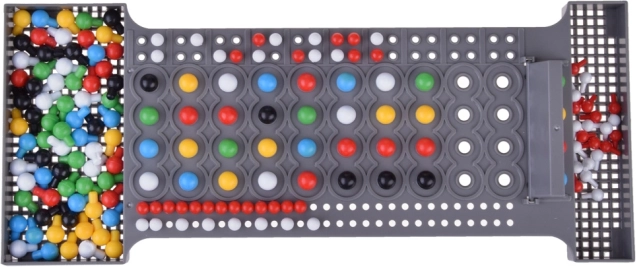 Die graue Kunststofftafel mit Raster und Aufbewahrungsfächern hält die bunten Stifte stets griffbereit und sorgt für Übersicht im Spiel.