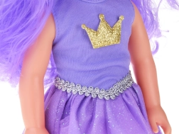 Das lilafarbene Kleid mit einem Emblem einer goldenen Krone und silbernem Gürtel verleiht der Puppe einen königlichen Look und fördert das fantasievolle Spiel.