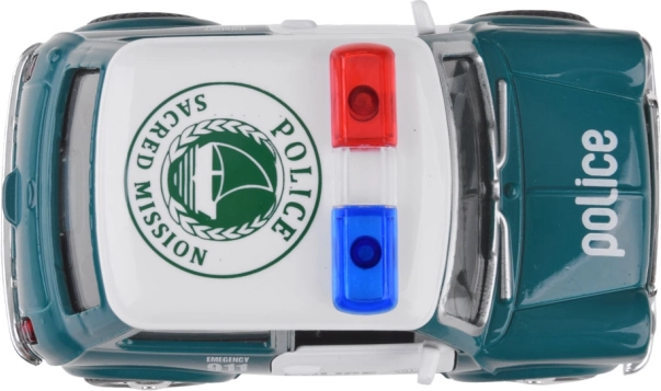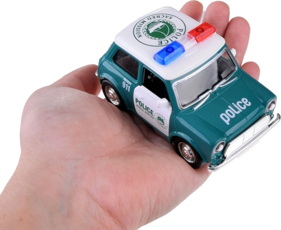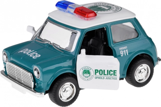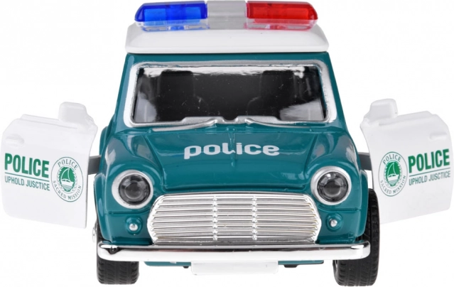 Das Miniatur-Polizeifahrzeug mit klassischem Design bietet realistische Details, darunter rote und blaue Leuchten sowie einen auffälligen Polizeiaufdruck. Die Metallkarosserie und die Gummiräder erhöhen die Robustheit und Haftung – ideal für den täglichen Spielspaß zu Hause und unterwegs.