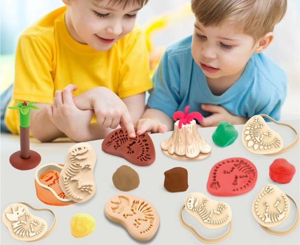 Formen und Ausstecher ermöglichen es Kindern, Skelettabdrücke und Spuren von Dinosauriern leicht in die Knete zu drücken. Ein spielerischer Weg, die Urzeit zu entdecken und die Vorstellungskraft zu fördern.
