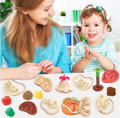Kreatives Knetset mit Dinosauriern eröffnet Kindern eine Welt der Fantasie und des Lernens. Mit sicheren Werkzeugen und Formen erstellen sie Abdrücke von versteinerten Dinosaurierskeletten, einem Vulkan oder Spuren. Fördert Feinmotorik, Kreativität und Farberkennung – das ideale Geschenk für kleine Entdecker.