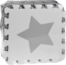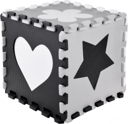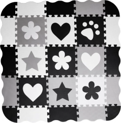 Die Spielmatte aus EVA-Schaum schützt vor Bodenkälte, dämpft Stürze und fördert die Entwicklung der Fein- und Grobmotorik. Das neutrale, kontrastreiche Design mit Herzchen, Sternen und weiteren Formen passt in jedes Kinder- oder Wohnzimmer.