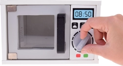Das Spielzeug ist mit realistischen Details gestaltet, einschließlich digitalem Timer und Drehregler, was interaktives Spielen unterstützt.