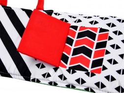 Dieses faltbare Sinnesbuch ist entworfen, um die Entwicklung aller Sinne des Kindes ab den ersten Lebensmonaten zu unterstützen. Es enthält verschiedene Texturen, Knisterelemente, einen Spiegel und lange Textilbänder, die taktile, visuelle und auditive Reize fördern. Zusammengefaltet ist es kompakt und leicht zu transportieren, ideal für Reisen. Zwei angenähte Schlaufen erleichtern dem Kind das Halten und Tragen.