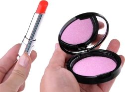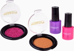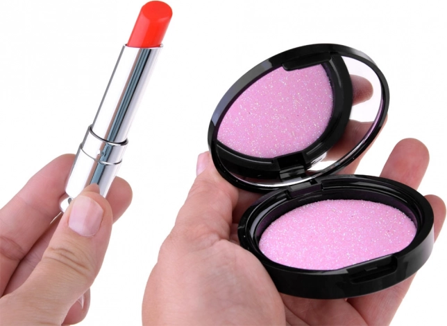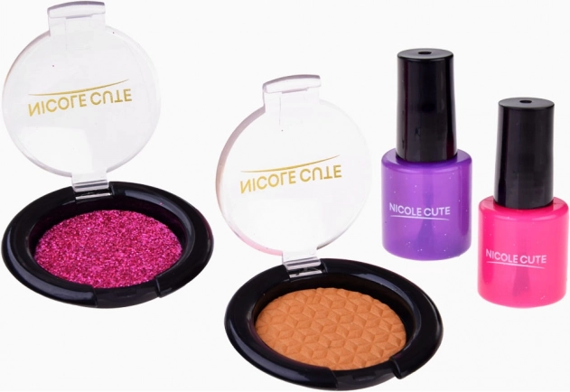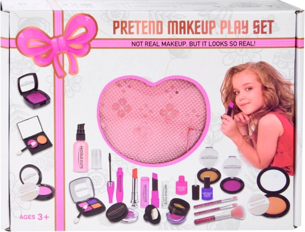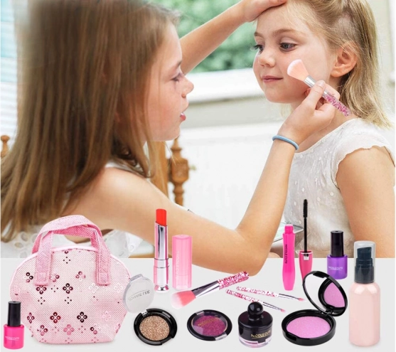 Das Set enthält verschiedene Arten von Schminkartikeln wie Lidschatten, Lippenstifte und Rouge, die ungiftig und für zarte Kinderhaut geeignet sind.