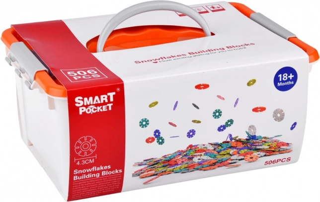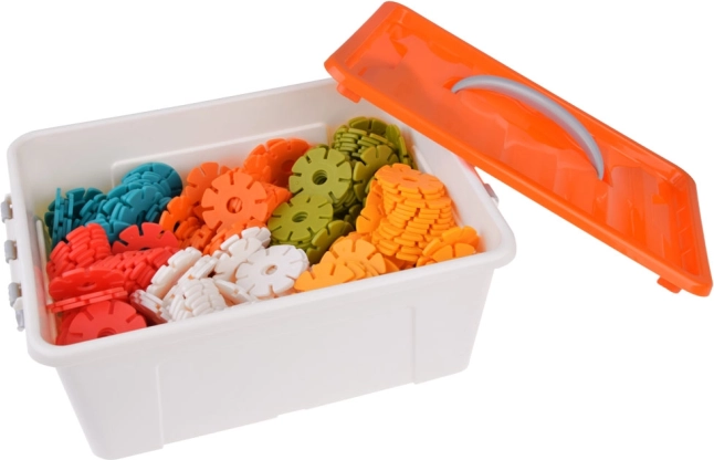 Der Baukasten enthält 506 Teile in 6 verschiedenen Farben: weiß, gelb, orange, rot, grün, blau. Die Bausteine sind in einer Kunststoffbox mit Deckel aufbewahrt, die über einen Griff zum einfachen Transport verfügt. Nach dem Spielen kann das Kind den Baukasten einfach aufräumen.