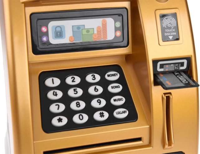 Machen Sie sich vertraut mit dem goldenen Automaten, der aussieht und funktioniert wie ein echter Bankautomat. Er ist aus Kunststoff gefertigt und bietet ein realistisches Design mit einer Tastatur, einem digitalen Display und einem Kartenschlitz. Durch Einstecken der Spielkarte und Eingabe der PIN aktivieren Kinder die Funktionen des Automaten.