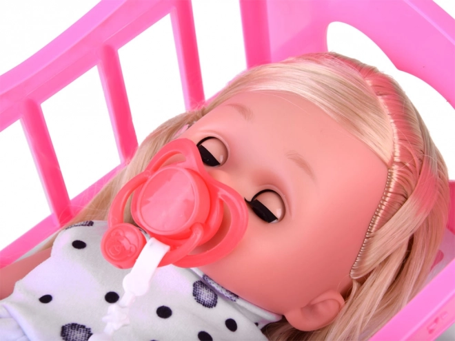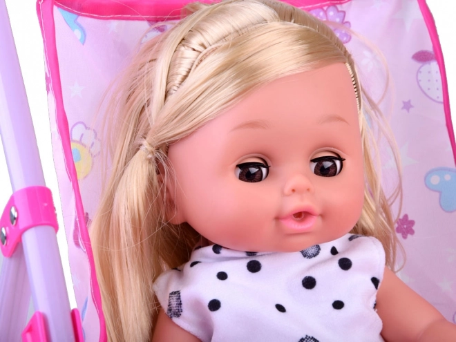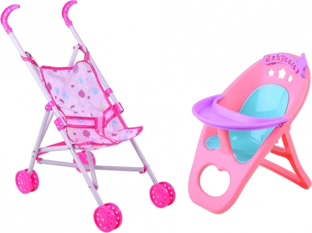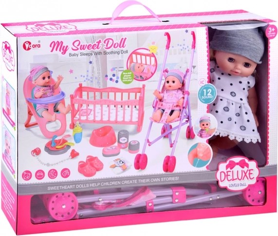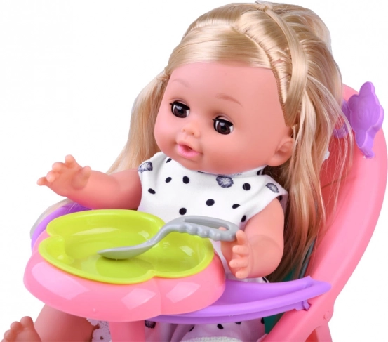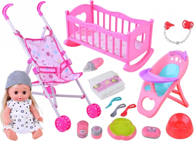 Die interaktive Puppe mit Kinderwagen und Hochstuhl ist ein großes Set, das es Ihnen ermöglicht, sich vollständig um Ihr kleines Baby zu kümmern. Es enthält alles Nötige für die tägliche Pflege.