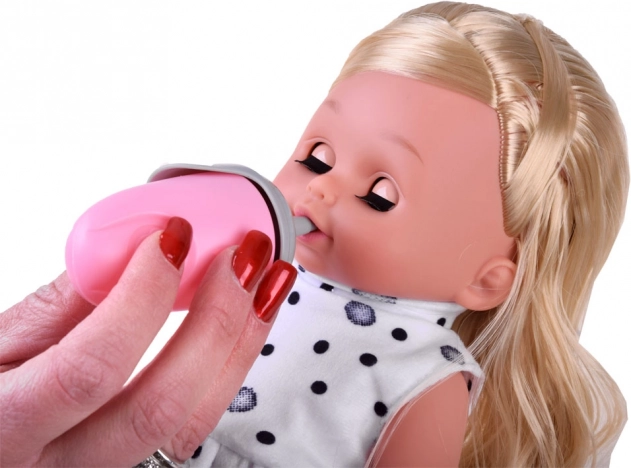 Sie können die Puppe mit der mitgelieferten Flasche füttern. Sie hat auch eine Pipi-Funktion, und im Set sind eine Windel und ein Töpfchen enthalten, auf das Sie die Puppe nach dem Essen setzen können.